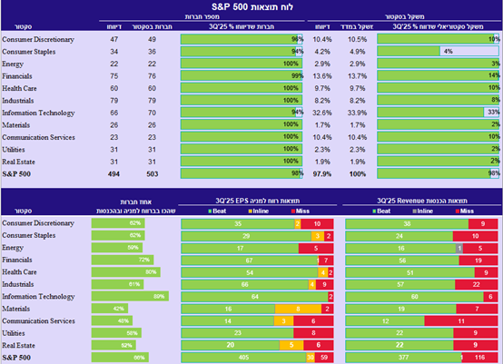 למול תחזיות מוקדמות לצמיחה של כ-6% בהכנסות וצמיחה של כ-5.9% ברווחים עונת הדוחות ניפצה את התחזיות כאשר בפועל הצמיחה בהכנסות עמדה על כ-7.8% בעוד שהצמיחה ברווחים זינקה בכ-13.9%. עיקר החששות הראשוניות היו מכיוון מחיקות על הפחתת נכסים מגל ה-CAPEX של השנים האחרונות לתחום הדאטה-סנטר-AI, אך אלו התבדו. כ-76% מהחברות הכות את התחזיות המוקדמות ברמת ההכנסות וכ-82% הכו את תחזיות הרווחים המוקדמות, כ-66% מהחברות הכו בשני הפרמטרים. הסקטור המצטיין של הרבעון, ללא הפתעה, היה סקטור הטכנולוגיה, כאשר 89% מהחברות מכות בשני הפרמטרים. סקטור הבריאות והפיננסים גם כן סיימו בתוצאות מרשימות ביותר. הסקטור החלש ביותר בו רק כ-42% מהחברות הכו בשני הפרמטרים היה סקטור הסחורות והחומרים.